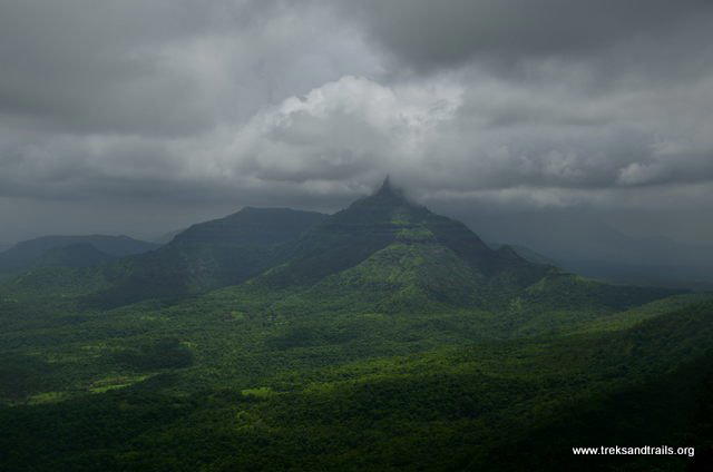 On the other side of the fort is a temple of a deity. Here is a big cistern. The disciples are constructing a good temple here. We can reside here for some time. The beautiful waterfall on the way is the main attraction here. The surrounding scenery looks marvellous from the cave in the monsoon. We also see the pinnacles of Navara-Navari, Bhatoba and Irshalgad Fort, and Chanderi Fort, Prabalgad Fort, Kalavantin Durg and Malanggad and also Nakhind Ridge. This trekking is pleasant in all seasons.